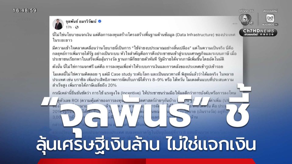 ทางด้านแคนดิเดตนายกรัฐมนตรีจากพรรคเพื่อไทย คุณจุลพันธ์ ได้โพสต์เฟสบุ๊ก ชี้แจงนโยบาย "สร้างเศรษฐีเงินล้าน วันละ 9 คน" ไม่ใช่นโยบายแจกเงิน แต่คือ การลงทุนสร้างโครงสร้างพื้นฐานด้านข้อมูลของประเทศในระยะยาว ตอนนี้ข้อมูลที่กระจายออกไปมีความเข้าใจคลาดเคลื่อนว่าใช้จ่ายงบประมาณอย่างสิ้นเปลือง