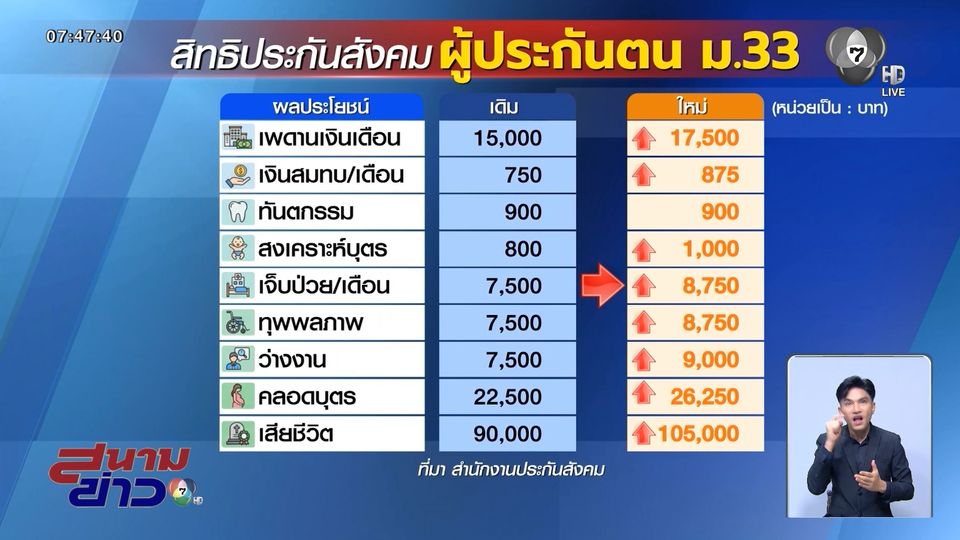เดิมเจ็บป่วยทุพพลภาพ สูงสุดต่อเดือน จาก 7,500 บาท ปรับเป็น 8,750 บาท, เงินคลอดบุตร ครั้งละ 22,500 บาท ปรับเป็น 26,250 บาท, เงินเสียชีวิต จาก 90,000 บาท ปรับเป็น 105,000 บาท นอกจากนี้ ยังมีกรณีว่างงานต่อเดือน เงินสงเคราะห์บุตร ที่ปรับเพิ่มมาก่อนหน้านี้