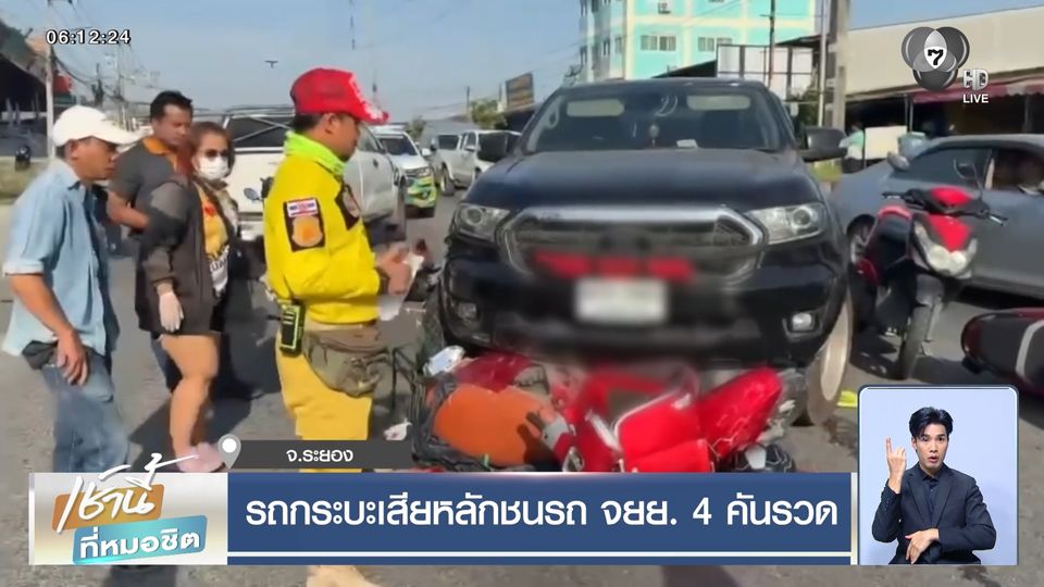 เช้านี้ที่หมอชิต - จังหวัดระยอง เกิดอุบัติเหตุระทึก ! รถกระบะชนรถจักรยานยนต์ 4 คัน บาดเจ็บ 5 คน