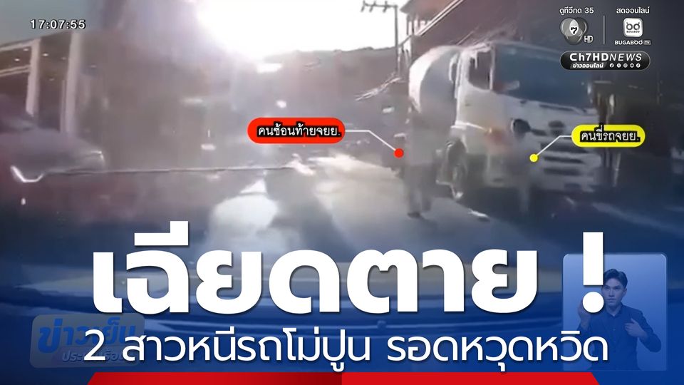 ข่าวเย็นประเด็นร้อน - นาทีเฉียดตาย ของ 2 สาว ขี่รถจักรยานยนต์ซ้อนท้ายกันออกมาจากตลาดสด ถูกรถบรรทุกโม่ปูน พุ่งชนทับรถเข้าอย่างจัง