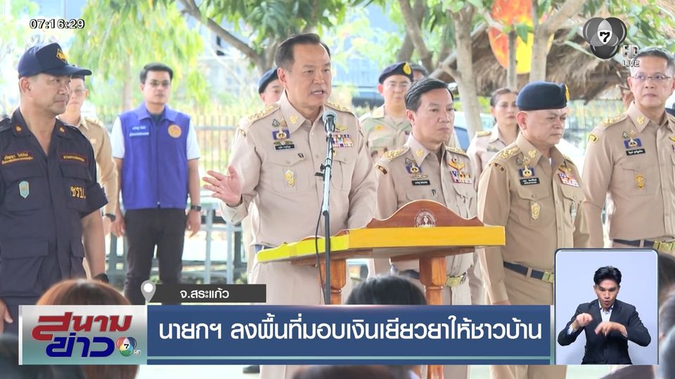สนามข่าว 7 สี - เรื่องเงินเยียวยาของชาวบ้านชายแดน จังหวัดสระแก้ว เมื่อวานนี้ นายกรัฐมนตรีลงพื้นที่พบปะประชาชนผู้ได้รับผลกระทบ มอบเงินเยียวยาบางส่วนให้ชาวบ้าน พร้อมสนับสนุนงบ ชรบ. หมู่บ้านละ 5,000 บาทต่อเดือน