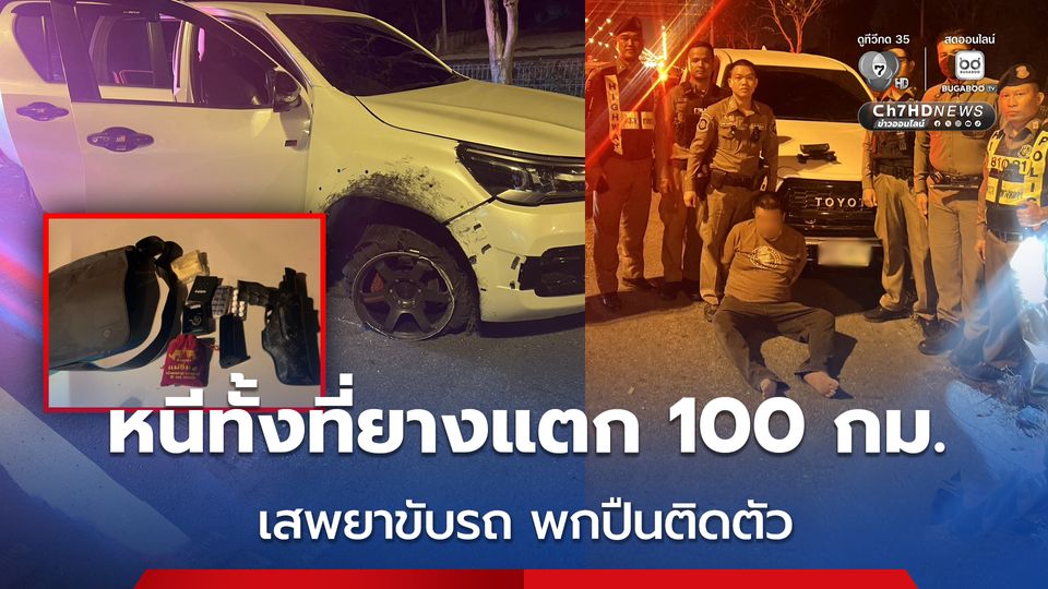 ตำรวจทางหลวงสกัดจับระทึกถนนมอเตอร์เวย์ ชายเสพยาขับรถกระบะ ซิ่งหนีทั้งที่ยางแตกระยะทางกว่า 100 กิโลเมตร ก่อนจนมุมพบพกปืนติดตัว