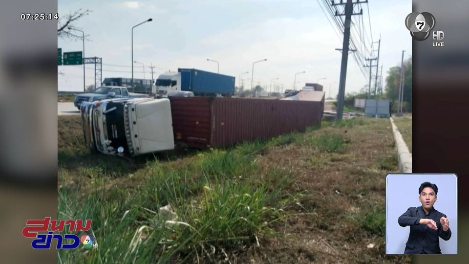 สนามข่าว 7 สี - ที่จังหวัดชลบุรี เกิดอุบัติเหตุรถบรรทุกเทรลเลอร์ ชนกับรถบรรทุกเทรลเลอร์ ด้วยกัน พลิกตะแคงตกร่องน้ำ