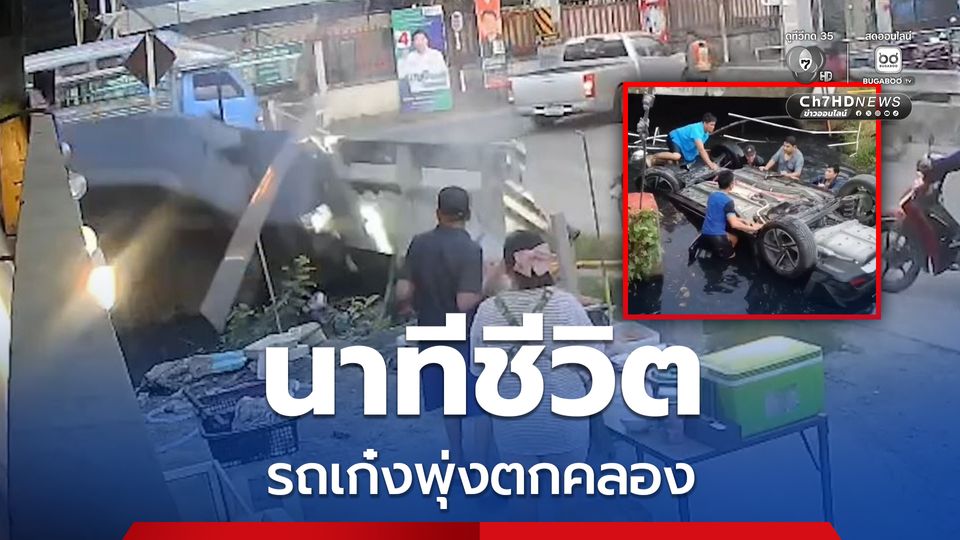 นาทีชีวิต อุบัติเหตุระทึก รถเก๋งเสียหลักชนราวกั้นขอบสะพานพุ่งตกคลอง พลเมืองดีช่วย 3 หนุ่ม ออกมาได้ทันก่อนจมน้ำ