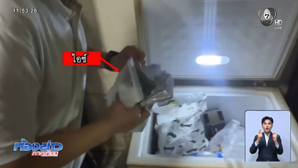 เป็นภาพขณะตำรวจ สภ.บางศรีเมือง ตรวจสอบตู้แช่เย็น ภายในอาคารพาณิชย์ อำเภอบางบัวทอง จังหวัดนนทบุรี พบไอซ์ น้ำหนักรวม 1.7 กิโลกรัม, ยาบ้า 40 เม็ด หลังผู้ต้องหาที่ถูกจับไปก่อนหน้านี้ให้การซัดทอดว่ารับยาเสพติดมาจาก นายอ้วน ตำรวจจึงขยายผลจับกุมเข้าจับกุม