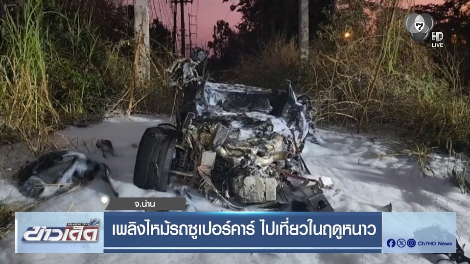 เป็นภาพกลุ่มควันไฟจากอุบัติเหตุรถซูเปอร์คาร์คันหนึ่ง เสียหลักลงข้างทางชนเสาไฟฟ้า และเกิดเพลิงไหม้ บนถนนสายน่าน-ทุ่งช้าง อำเภอท่าวังผา จังหวัดน่าน ตำรวจ ทีมกู้ชีพกู้ภัย รถดับเพลิง เข้าตรวจสอบ พบรถซูปเปอร์คาร์ สีขาว ชนเสาไฟฟ้าริมถนน สภาพรถเกิดเพลิงไหม้อย่างรุนแรงจนเสียหายทั้งคัน เหลือเพียงซากเศษเหล็ก รถซูเปอร์คาร์คันนี้ ราคาประมาณ 25 ล้านบาท