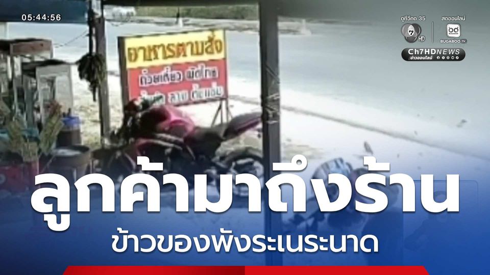 สนามข่าวเสาร์-อาทิตย์ - รถจักรยานยนต์บิกไบก์ ขี่มาด้วยความเร็ว เจอรถบรรทุกกำลังยูเทิร์น หักหลบไม่ทันเฉี่ยวชนท้าย ก่อนพุ่งเข้าร้านอาหารตามสั่ง ชนข้าวของพังระเนระนาด