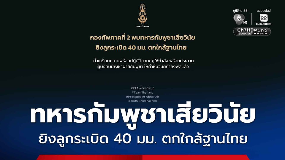 กองทัพภาคที่ 2 พบทหารกัมพูชาเสียวินัยยิงลูกระเบิด 40 มม. ตกใกล้ฐานไทย ย้ำเตรียมความพร้อมปฏิบัติตามกฎใช้กำลัง พร้อมประสาน ผู้บังคับบัญชาฝ่ายกัมพูชา ให้กำชับวินัยกำลังพลแล้ว