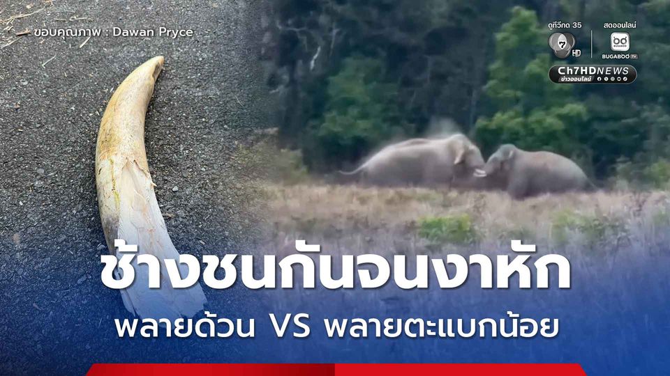 "พลายด้วน" กับ "พลายตะแบกน้อย" ช้างป่าเขาใหญ่ชนกันจนงาหัก โชคดีที่หักส่วนกลางของงา ไม่ได้หลุดถึงโคน
