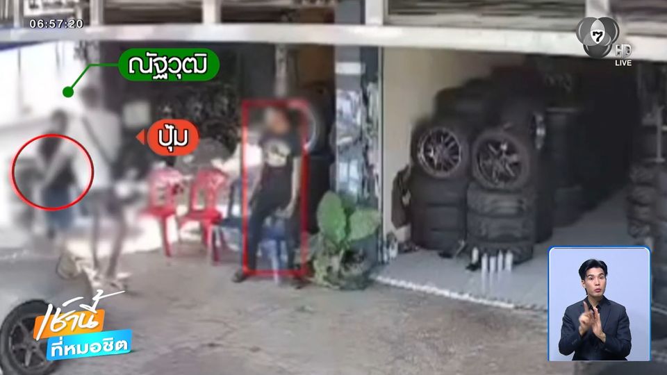 กล้องวงจรปิดหน้าร้านขายยางรถยนต์ ในจังหวัดปราจีนบุรี บันทึกภาพขณะ นายปุ้ม (ผู้ก่อเหตู) ใช้กระติกน้ำเก็บความเย็นปาใส่หัว นายณัฐวุฒิ อายุ 28 ปี ผู้เสียหาย