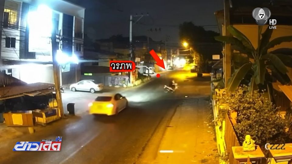 กล้องวงจรปิดบริเวณสามแยกพิกุล ถนนสุขาภิบาล ตำบลบางศรีเมือง อำเภอเมืองนนทบุรี บันทึกภาพหลักฐานขณะที่ นายวรภพ อายุ 50 ปี ขี่รถจักรยานยนต์ เลี้ยวตัดหน้าคู่กรณี ที่มาทางตรง ถูกชนอย่างแรงจนแน่นิ่ง