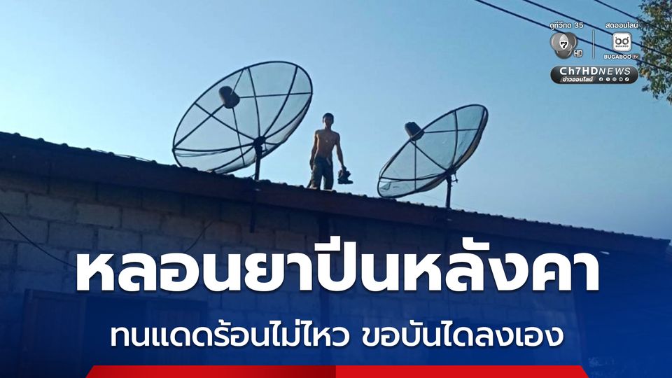 หนุ่มวัย 16 ปี หลอนยาปีนขึ้นหลังคาบ้านกระโดดไปกระโดดมา เจ้าหน้าที่ตำรวจกล่อมนานกว่า 10 ชม. ไม่ได้ผล สุดท้ายบนหลังคาแดดร้อนและหิวน้ำ จึงขอบันไดปีนลงมาเอง ก่อนคุมตัวส่งบำบัดรักษาต่อไป