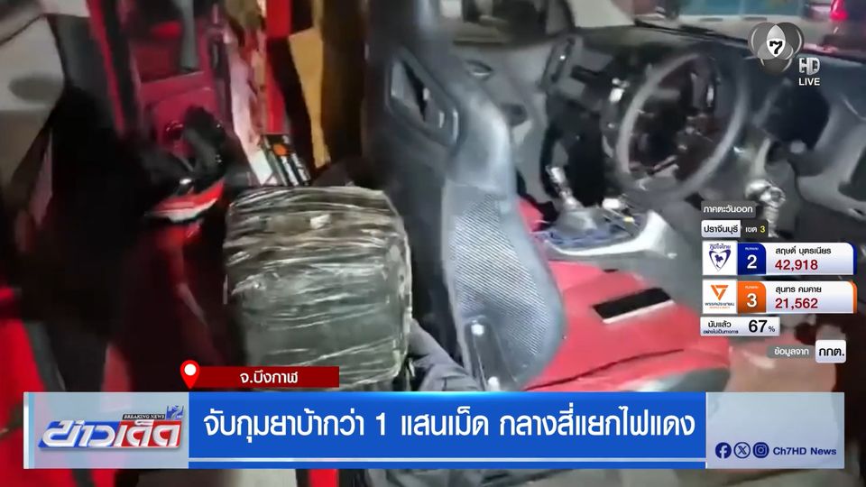 เป็นภาพขณะที่ตำรวจ กองบังคับการสืบสวนสอบสวน ตำรวจภูธรภาค 4 เข้าตรวจค้นและจับกุมผู้ต้องสงสัย ในรถกระบะสีแดง ที่จอดอยู่บริเวณสี่แยกแห่งหนึ่ง ในอำเภอเซกา จังหวัดบึงกาฬ พร้อมควบคุมตัว นายวี อายุ 35 ปี และจากการตรวจค้นเบาะด้านหลังคนขับ พบยาบ้าจำนวน 108,000 เม็ด ถูกพันด้วยเทปกาวสีดำ นอกจากนี้ยังพบปืนพกขนาด .380 จำนวน 1 กระบอก และเครื่องกระสุนอีก 16 นัด อยู่ในช่องเก็บของข้างคนขับ