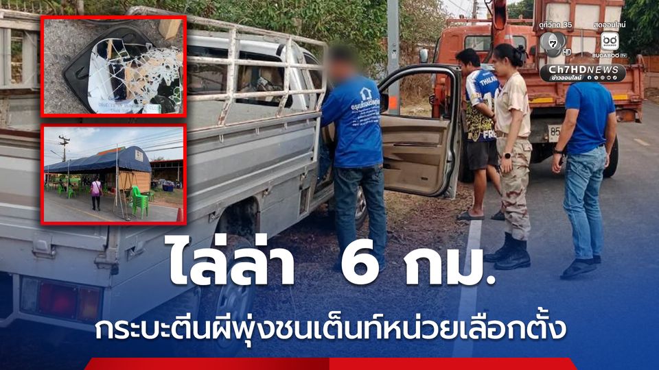 กระบะตีนผีพุ่งชนเต็นท์หน่วยเลือกตั้งใน จ.นครราชสีมา ก่อนซิ่งหนี ถูกไล่ล่ากว่า 6 กม. พบคนขับมีอาการคล้ายมึนเมา