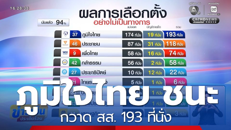ข่าวเย็นประเด็นร้อน - ข่าวแรกวันนี้ มาสรุปผลการเลือกตั้งจาก กกต. อย่างไม่เป็นทางการ โดยพรรคภูมิใจไทยชนะเลือกตั้ง กวาดเก้าอี้ สส.ไปมากที่สุด