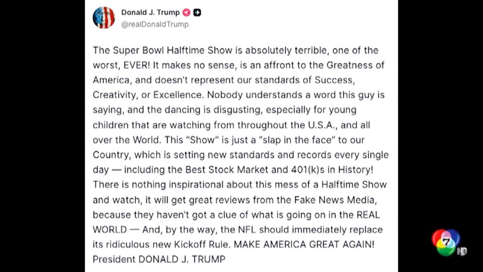 ก่อนหน้านั้น "ทรัมป์" โพสต์วิจารณ์การแสดงคอนเสิร์ตช่วงพักครึ่งเวลาของซูเปอร์โบวล์ปีนี้ว่าเป็นโชว์ที่ห่วยที่สุดเท่าที่เคยมีมา ซึ่งคาดว่าเป็นเพราะศิลปินนำคือ "แบด บันนี" (Bad Bunny) นักร้องชาวเปอร์โตริโก ที่เคยสนับสนุน นางคอมมาลา แฮริส คู่แข่งในการเลือกตั้งประธานาธิบดีจากพรรคเดโมแครต เมื่อปี 2567 และยังวิจารณ์นโยบายปราบปรามผู้อพยพของ "ทรัมป์" อย่างรุนแรงมาตลอด