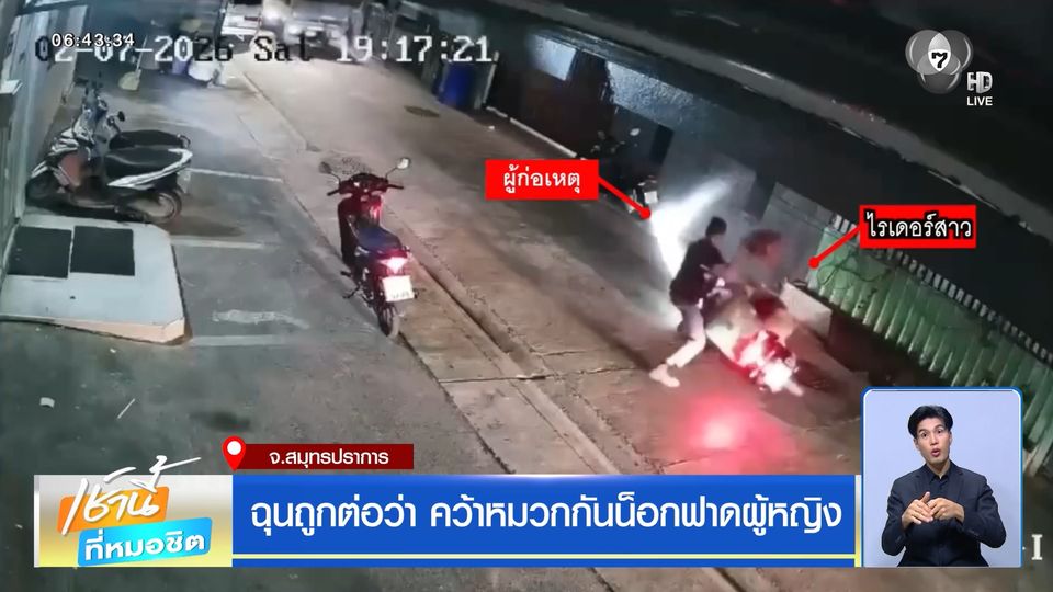 วงจรปิดในซอยมิตรไมตรี 5 อำเภอเมือง จังหวัดสมุทรปราการ เผยนาทีหนุ่มไรเดอร์หัวร้อน คว้าหมวกกันน็อกวิ่งเข้าไปฟาดไรเดอร์สาว ทั้งคนทั้งรถล้มลงไปกองกับพื้น ผู้เสียหายวิ่งหนีไปขอความช่วยเหลือจากพลเมืองดี