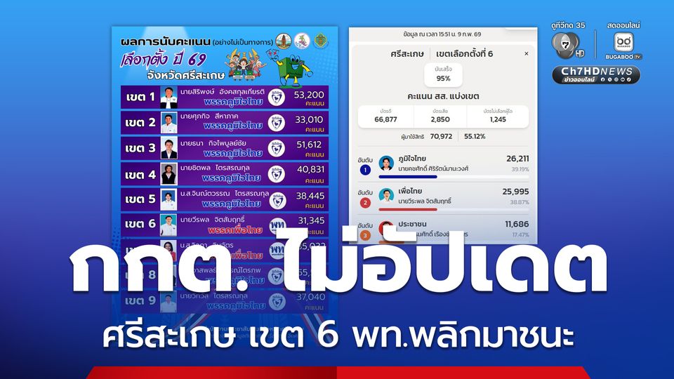 ไม่ใช่นับคะแนนใหม่ แต่ กกต.ไม่ได้อัปเดตผลคะแนน ศรีสะเกษเขต 6 วีระพล จิตสัมฤทธิ์ เพื่อไทย พลิกกลับมาชนะภูมิใจไทย ห่างกันไม่ถึง 300 คะแนน