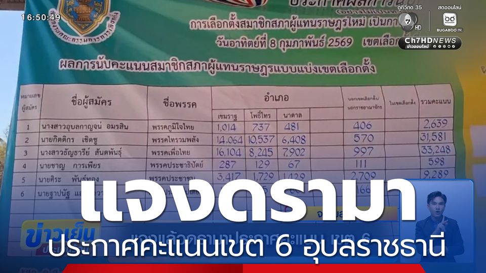 ข่าวเย็นประเด็นร้อน - ประกาศคะแนนแล้ว การเลือกตั้ง สส. เขตการเลือกตั้งที่ 6 จังหวัดอุบลราชธานี ขณะที่ กกต.จังหวัดอุบลราชธานี ชี้แจงประเด็นดรามาปมตัวเลขคลาดเคลื่อน เหตุเพราะไม่ได้รวมคะแนนเลือกตั้งล่วงหน้า