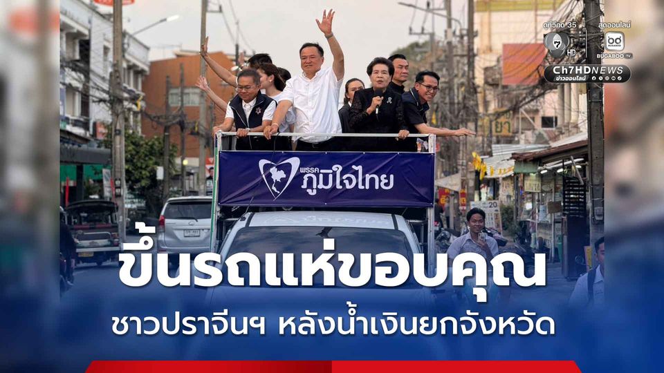 ประเดิมปราจีนฯ อนุทิน พร้อม ว่าที่ สส.ปราจีน 3 เขต ขึ้นรถแห่ขอบคุณประชาชน หลังน้ำเงินยกจังหวัด แฟนคลับชม “เก่งมาก ภูมิใจไทยจงเจริญ” พร้อมทวงคนละครึ่งพลัส เฟสสอง