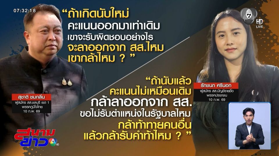 สนามข่าว 7 สี - เรียกว่าเป็นมวยถูกคู่ สำหรับ เสี่ยเฮ้ง สุชาติ และ คุณไอซ์ รักชนก ที่ออกมาท้ากันไปมา หลังมีปัญหานับคะแนนเลือกตั้ง เขต 1 ชลบุรี จนถึงตอนนี้ยังไม่ได้ข้อสรุปว่าจะต้องนับใหม่หรือไม่ กกต. บอกให้รอ 2 วัน