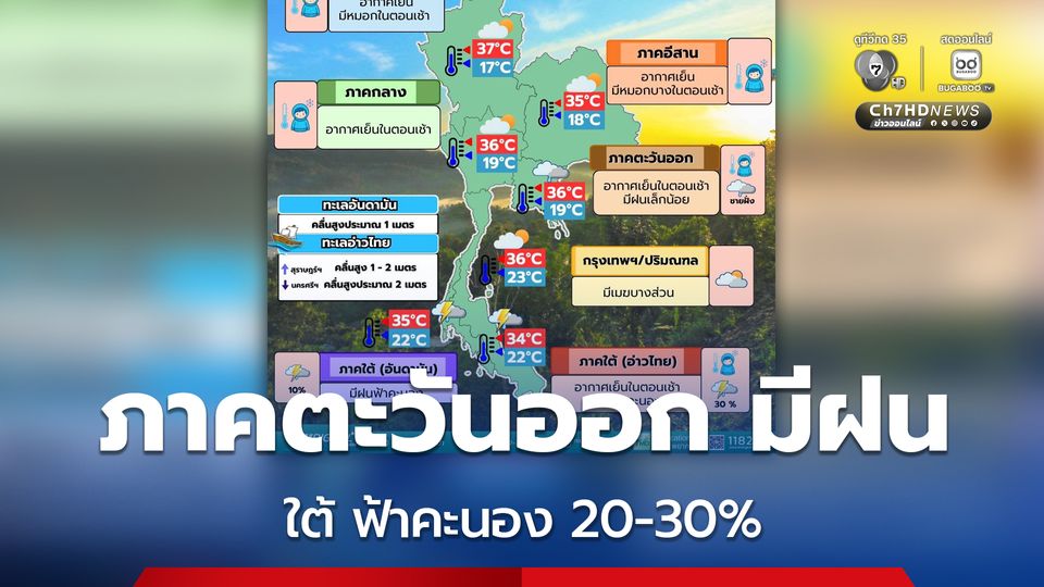 ทั่วไทยเริ่มมีอุณหภูมิสูงขึ้น อากาศเย็นในตอนเช้า ภาคตะวันออกมีฝนเล็กน้อย บางแห่งตามแนวชายฝั่ง กทม.ปริมณฑล เมฆบางส่วน ขณะที่ภาคใต้มีฝนฟ้าคะนอง 20-30% ของพื้นที่
