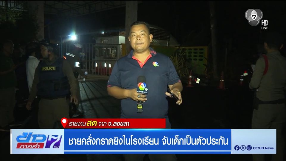 ข่าวภาคค่ำ - เมื่อช่วงเย็นที่ผ่านมา เกิดเหตุคนร้ายพร้อมปืนสงครามบุกเข้าไปในโรงเรียนแห่งหนึ่งที่อำเภอหาดใหญ่ จังหวัดสงขลา ยิงครูและนักเรียนบาดเจ็บ อีกทั้งได้จับนักเรียนบางส่วนไว้เป็นตัวประกัน สถานการณ์ล่าสุดเป็นอย่างไร คุณเตชะวัฒน์ สุขรักษ์ ปักหลักอยู่ในพื้นที่ รายงานสดเข้ามา