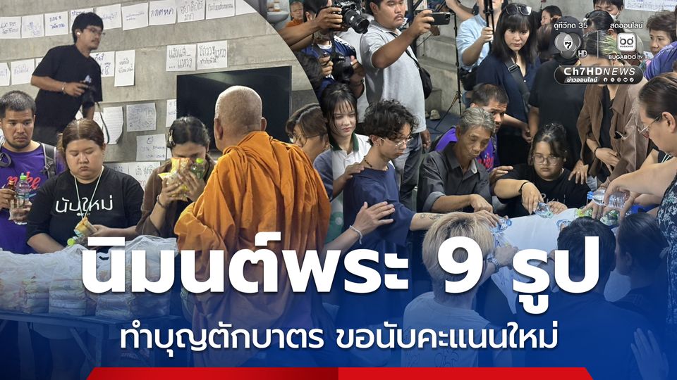 ชลบุรีเขต 1 กลุ่มมวลชนนิมนต์พระสงฆ์ 9 รูป ตักบาตรทำบุญเชิงสัญลักษณ์ ตั้งจิตอธิษฐานขอให้ กกต. นับคะแนนใหม่