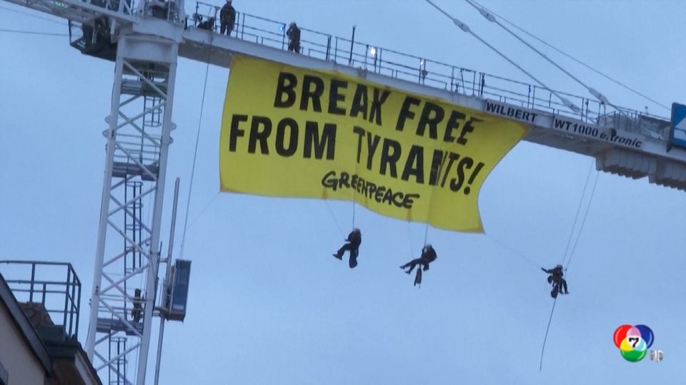 วันนี้ (13 ก.พ.) กลุ่มกรีนพีซ จัดกิจกรรมประท้วงที่เครนก่อสร้างหลังอาคารแห่งหนึ่ง ซึ่งอยู่ใกล้กับจตุรัสมาเรียนพลาทซ์ ในเมืองมิวนิก ทางตอนใต้ของเยอรมนี ซึ่งเป็นสถานที่จัดการประชุมความมั่นคงมิวนิกครั้งที่ 62 โดยผู้ประท้วงปีนขึ้นไปโรยตัวแขวนป้ายผ้าขนาดใหญ่ที่มีข้อความว่า "ปลดปล่อยตนเองจากทรราช" เพื่อต่อต้านการพึ่งพาก๊าซธรรมชาติจากรัสเซียและสหรัฐฯ ของหลายประเทศในทวีปยุโรป และเรียกร้องให้หันไปใช้พลังงานหมุนเวียนแทนเชื้อเพลิงฟอสซิลมากขึ้น