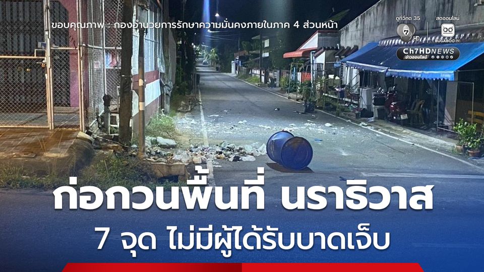 วันนี้ (15 ก.พ. 69) กอ.รมน.ภาค 4 ส่วนหน้า รายงานสถานการณ์เหตุคนร้ายไม่ทราบจำนวนลอบวางระเบิดก่อกวนในพื้นที่จังหวัดนราธิวาส ห้วงวันที่ 14 – 15 กุมภาพันธ์ 2569 รวมจำนวน 7 จุด โดยไม่มีผู้ได้รับบาดเจ็บหรือเสียชีวิต รายละเอียดดังนี้