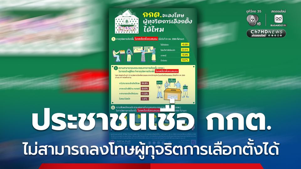 วันนี้ (15 ก.พ.69) ศูนย์สำรวจความคิดเห็น “นิด้าโพล” เปิดเผยผลการสำรวจเรื่อง “กกต. จะลงโทษผู้ทุจริตการเลือกตั้ง ได้ไหม” ทำการสำรวจประชาชนอายุ 18 ปีขึ้นไป และมีสิทธิเลือกตั้ง ทั่วประเทศ 1,310 คน