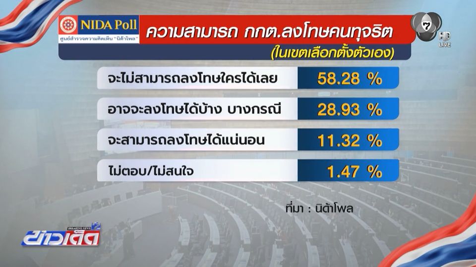 ข่าวเด็ด 7 สี - นิด้าโพล ออกสำรวจคนมีสิทธิเลือกตั้งทั่วประเทศ กับ กกต. จะลงโทษผู้ทุจริตการเลือกตั้ง ได้หรือไม่ พบผลสำรวจเกินครึ่ง พบว่า จะไม่สามารถลงโทษใครได้เลย มีเพียง 11.32 เปอร์เซ็นต์ ที่บอกว่า จะสามารถลงโทษได้แน่นอน