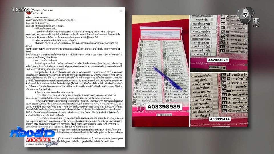 ห้องข่าวภาคเที่ยง สุดสัปดาห์ - ตลอดสัปดาห์ที่ผ่านมา ร้อนสุดก็ต้องเป็น กกต. ถูกฟ้องและร้องเรียนเป็นจำนวนมากเกี่ยวกับการเลือกตั้งที่ผ่านมา จนเมื่อเช้านี้ คุณแสวง ก็ได้อธิบายบาร์โค้ดที่อยู่ในบัตรเลือกตั้ง ที่คะแนนคนใช้สิทธิเป็นความลับแน่นอน แต่ก็ไม่ละเว้นต้องเป็นทั้งกลุ่มบุคคลและบุคคล เรียงหน้ามายื่นคณะกรรมการเลือกตั้ง หรือ กกต. ตลอดทั้งสัปดาห์ ในเรื่อง QR Code และ Barcode ที่ทำใหัทราบว่าใครมาลงคะแนน ซึ่งขัดต่อรัฐธรรมนูญ และ พ.ร.ป.สส. การเลือกตั้งครั้งนี้ จะต้องเป็นโมฆะ