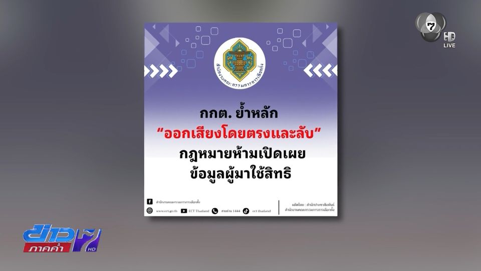 ข่าวภาคค่ำ - กกต. แจง หลักการเลือกตั้ง-ออกเสียงโดยตรงและลับ ย้ำห้ามเปิดเผยข้อมูลผู้มาใช้สิทธิ แต่ยังมีข้อห่วงใยกับรายชื่อที่อาจหลุดไปอยู่ในมือผู้ไม่หวังดี ขอให้ กกต.ต้องรีบแก้ไขก่อนผู้ที่มาใช้สิทธิได้รับผบกระทบ