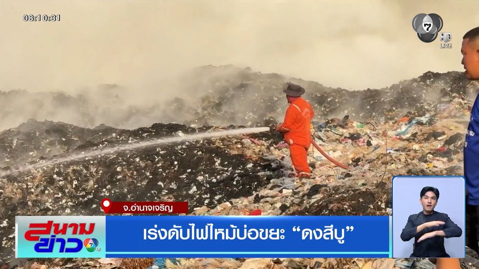 สนามข่าว 7 สี - เจ้าหน้าที่หลายหน่วยในจังหวัดอำนาจเจริญ เร่งดับไฟไหม้บ่อขยะ ดงสีบู หวั่นลุกลามพื้นที่กว่า 90 ไร่