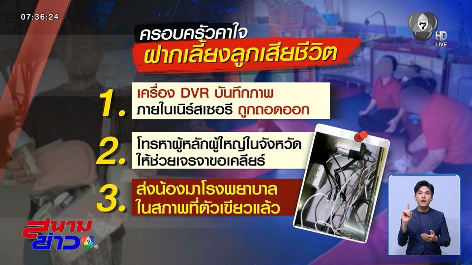 สนามข่าว 7 สี - พ่อ-แม่ติดใจ ช่วงเช้าส่งลูกสาววัยไม่ถึง 1 ขวบ ไปฝากเลี้ยงที่เนิร์สเซอรี ตกบ่ายมีสายโทรแจ้งว่าน้องสำลักนมเสียชีวิต
