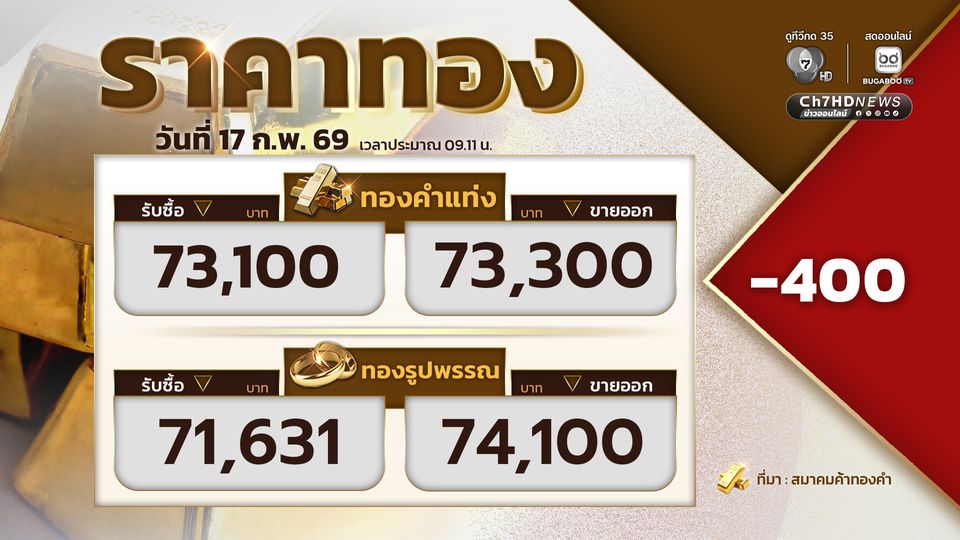 วันนี้ (17 ก.พ.69) สมาคมค้าทองคำ รายงานราคาทองวันนี้ เปิดตลาดราคาทองปรับลง 400 บาท ทองคำแท่ง รับซื้อบาทละ 73,100 บาท ขายออกบาทละ 73,300 บาท ทองรูปพรรณ รับซื้อบาทละ 71,631 บาท ขายออกบาทละ 74,100 บาท