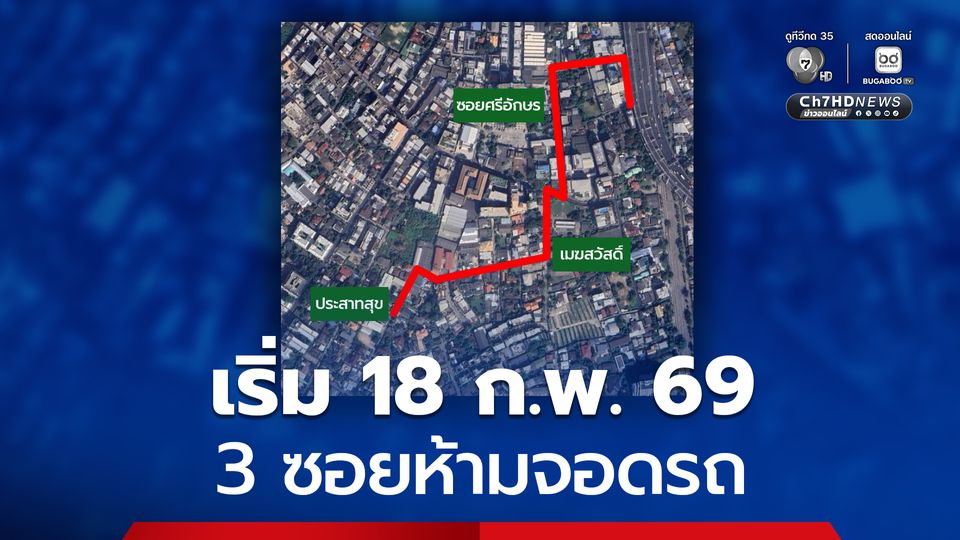 เริ่มแล้ว 18 ก.พ. 69 ราชกิจจานุเบกษาประกาศห้ามจอดรถในซอยศรีอักษร ซอยเมฆสวัสดิ์ และซอยประสาทสุข ย่านยานนาวา–สาธร กทม. เพื่ออำนวยความสะดวกด้านการจราจรและเพิ่มความปลอดภัยในพื้นที่เขตเมืองชั้นใน