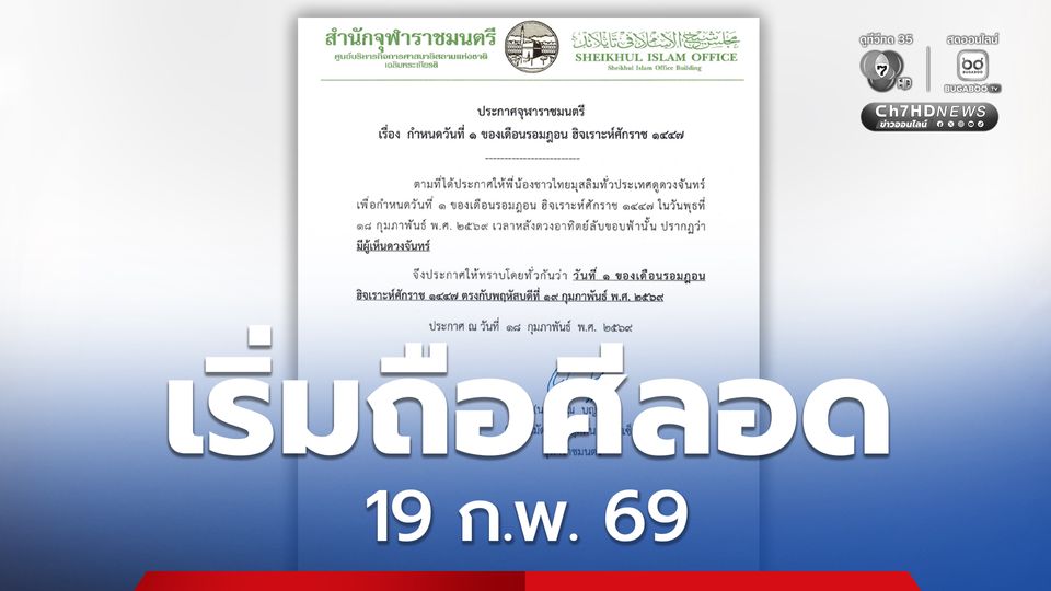 ประกาศจุฬาราชมนตรี กำหนดวันที่ 1 ของเดือนรอมฎอน ฮิจเราะห์ศักราช 1447 ตรงกับวันที่ 19 ก.พ.69 เริ่มถือศีลอด