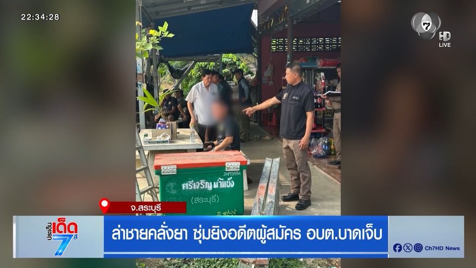 ประเด็นเด็ด 7 สี - อีกเหตุการณ์ เป็นเรื่องของชายคลั่งยา ปรากฎว่าคดีนี้ตำรวจต้องกระจายกำลังปิดล้อมตลอดทั้งวัน หลังชายคลั่งแอบใช้ปืน ไปซุ่มยิงรองนายก อบต.แห่งหนึ่ง ใน จังหวัดสระบุรี กระสุนถูกศีรษะบาดเจ็บ ก่อนจะเดินถือปืนหนีขึ้นไปบนภูเขา ตำรวจปูพรมปิดล้อมพื้นที่ล่าสุดยังคุมตัวไม่ได้