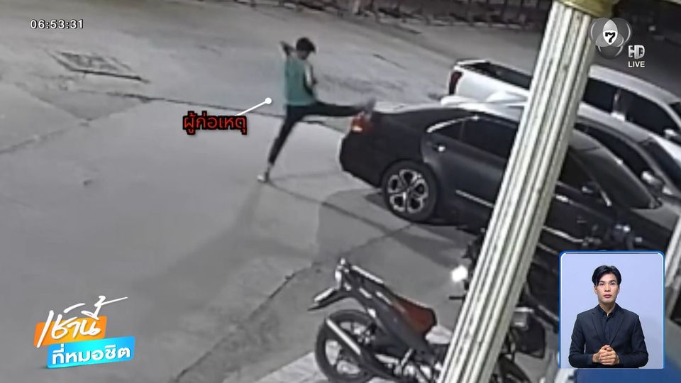 เจ้าของรถเก๋งรีบลงมาจากห้องพักมาดูรถ ด้วยความตกใจ พบรถถูกถีบไฟท้ายแตก ด้านข้างมีรอยบุบ และมีรอยเท้าของผู้ก่อเหตุฝากเอาไว้