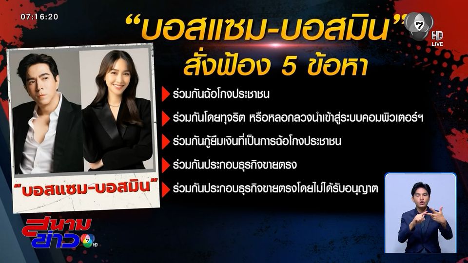 สนามข่าว 7 สี - อัยการสูงสุดมีความเห็นสั่งฟ้อง "บอสมิน-บอสแซม" 2 ผู้ต้องหาในคดี ดิไอคอน กรุ๊ป เตรียมนัดหมายยื่นฟ้องต่อศาลฯ ทำให้ทั้ง 2 ต้องกลับเข้าคุก