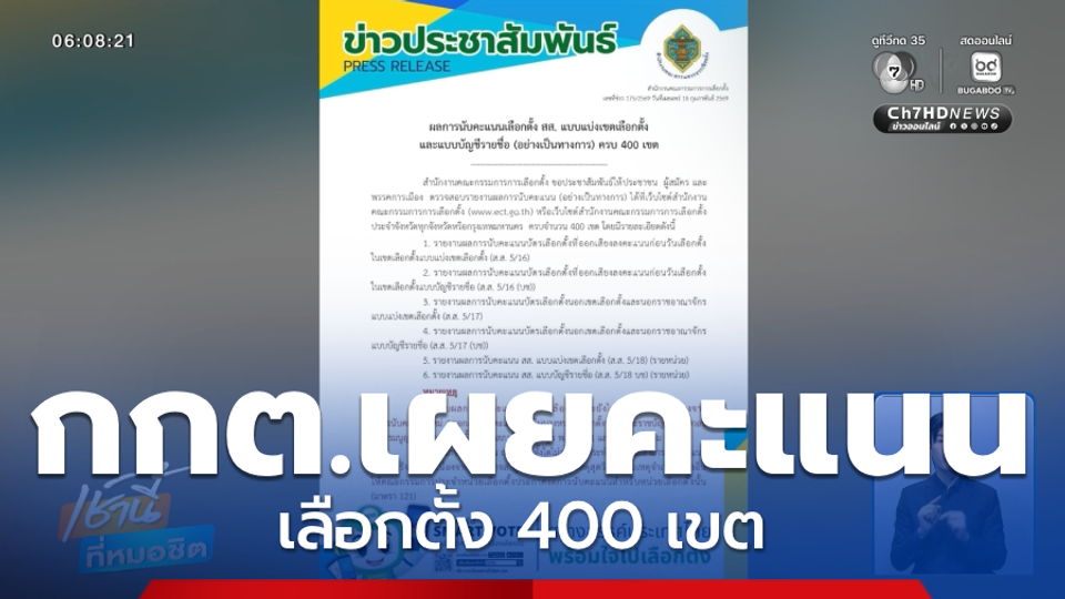 "ข่าวดี กกต. ประกาศผลคะแนนเลือกตั้งทุกหน่วย ทั้ง 400 เขตครบ 100% อย่างเป็นทางการแล้ว เมื่อเย็นวันที่ 18 กุมภาพันธ์ 2569 หลังจากผ่านวันเลือกตั้งไป 10 วัน