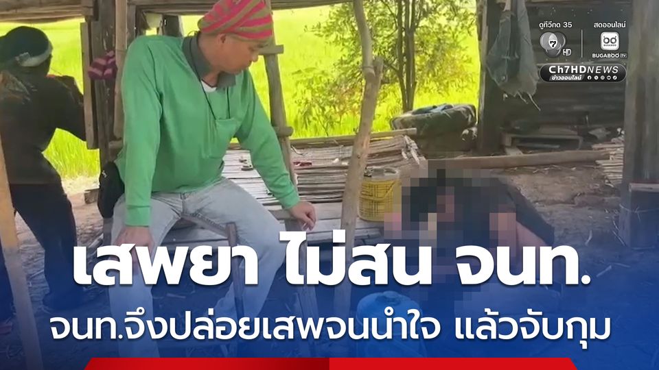 ชายสูบกัญชา - เสพยาบ้า ที่แคร่ไม้ด้านหน้ากระท่อม เจ้าหน้าที่ไปพบก็ไม่สน เจ้าหน้าที่จึงปล่อยให้เสพจนนำใจ เมาจนยืนไม่ไหว แล้วจับกุมดำเนินคดี