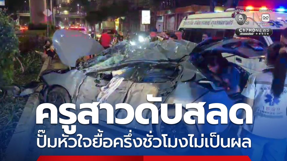 อุบัติเหตุสลด ครูสาววัย 27 ปี ขับรถเก๋งเฉี่ยวรถแท็กซี่ ตรงจุดกลับรถ แล้วเหินข้ามเกาะกลางถนนไปชนตอม่อรถไฟฟ้าบีทีเอส กู้ภัยปั๊มหัวใจยื้อชีวิตครึ่งชั่วโมงไม่เป็นผล
