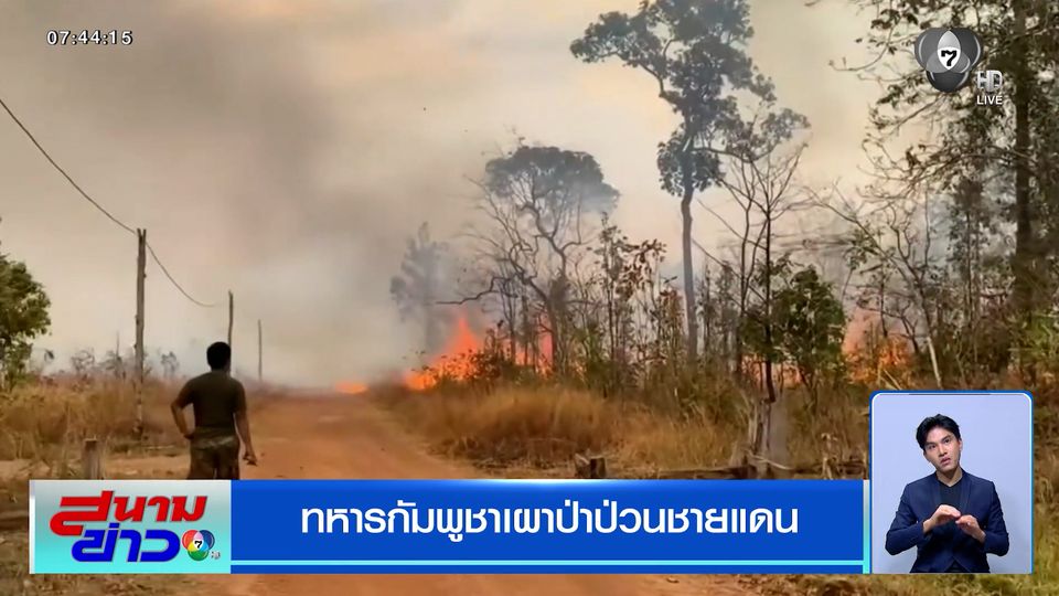 สนามข่าว 7 สี - ทหารกัมพูชายังไม่หยุดเผาป่าตามแนวชายแดน แม้จะเจอลมเปลี่ยนทิศอยู่หลายครั้ง จนไฟลามลามเข้าเขตชุมชนของกัมพูชา พวกเขาก็ยังไม่หยุดเผา แถมยังใส่ร้ายทหารไทยว่าเป็นคนจุดไฟ