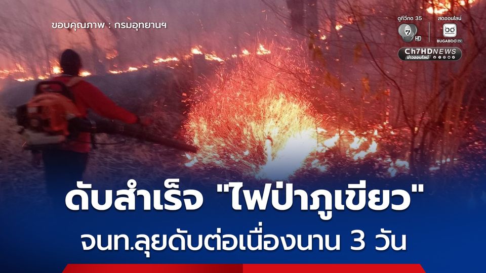 ระดมกำลังกว่า 100 นาย เข้าดับ “ไฟป่าภูเขียว” ต่อเนื่องนาน 3 วัน ส่งเฮลิคอปเตอร์โปรยน้ำกว่า 7 หมื่นลิตร จนสามารถดับไฟได้แล้ว พบพื้นที่ความเสียหายรวมประมาณ 190 ไร่