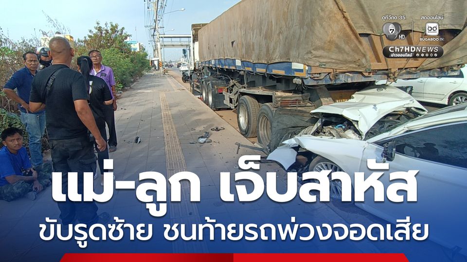 อุทาหรณ์อุบัติเหตุ รถเก๋งขับรูดซ้าย พุ่งชนท้ายรถบรรทุกพ่วงจอดเสียข้างทาง แม่กับลูกสาว 10 ขวบ บาดเจ็บสาหัส ชาวบ้านเห็นเหตุการณ์เผยมีกรวยตั้งเตือน 10 เมตร แต่รถเก๋งไม่ชะลอความเร็ว