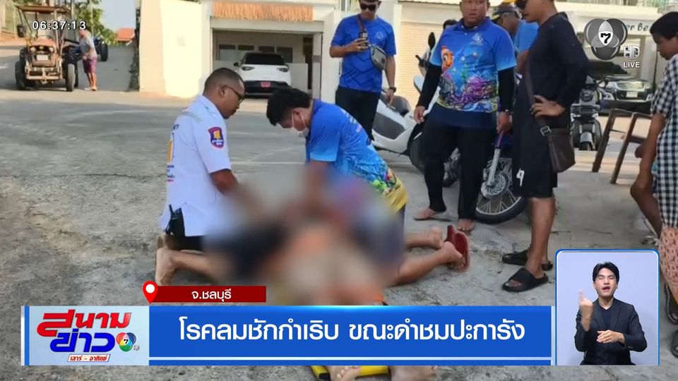 เจ้าหน้าที่กู้ชีพ ช่วยกันนำนักท่องเที่ยวกลับเข้าฝั่ง พร้อมเร่งทำซีพีอาร์ หลังหมดสติอยู่กลางทะเล บริเวณใกล้เกาะคราม อำเภอสัตหีบ จังหวัดชลบุรี