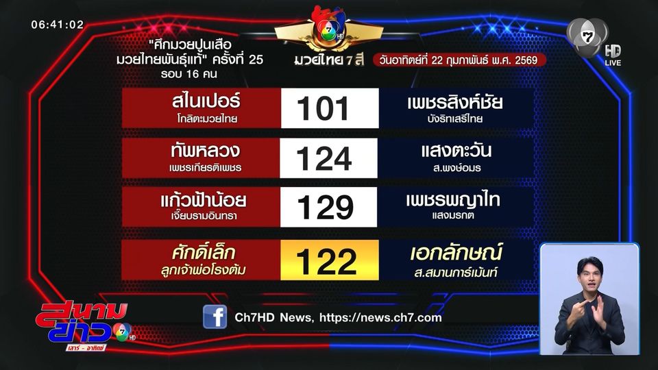 โปรแกรมมวยไทย 7 สี วันอาทิตย์ที่ 22 กุมภาพันธ์ 2569 ถ่ายทอดสดช่อง 7HD เวลา 14.30 น.